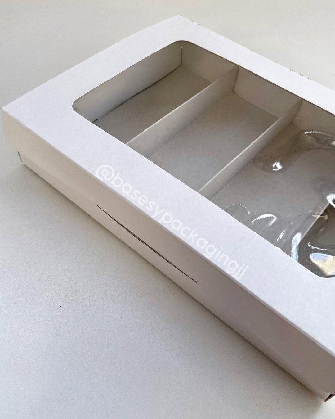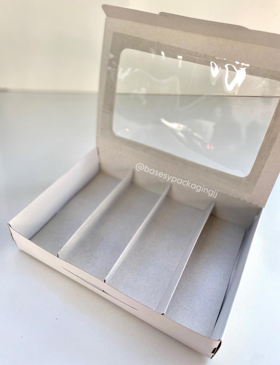 Cajas de cartulina blanca con visor y divisiones, ideal para porciones de 4x4cm o 5x5cm